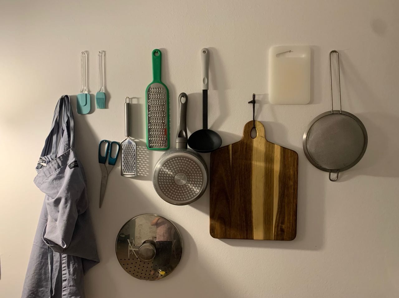 Прокачал на кухне стену. Вбил гвоздики и повесил часто используемую утварь. Теперь кайфую — мне красиво и удобно.